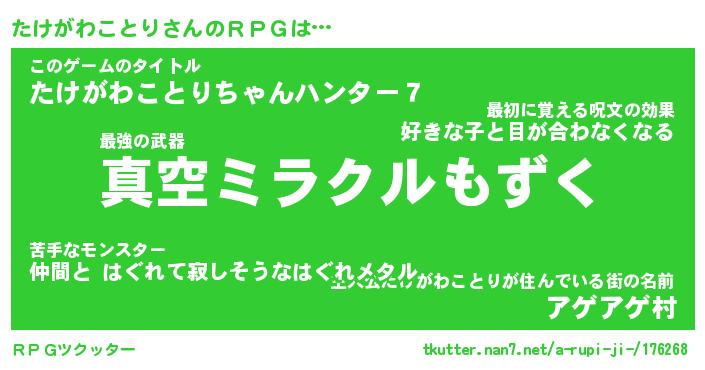 | 男性向けラノベタイトル風あだ名 | 『タケガワコトリアートオンライン』 |