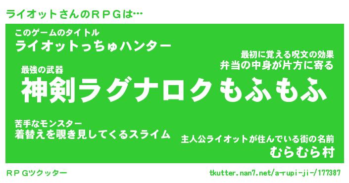 | 男性向けラノベタイトル風あだ名 | 『ライオットの憂鬱』 |