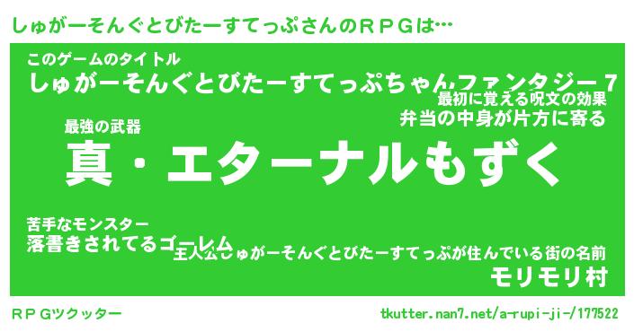 | 胡散臭い通販商品みたいなあだ名 | 『億万長者になれる水晶球…その名も「しゅがーそんぐとびたーすてっぷ」』 |