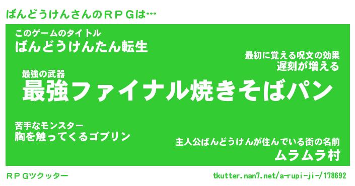| 男性向けラノベタイトル風あだ名 | 『バンドウケンアートオンライン』 |
