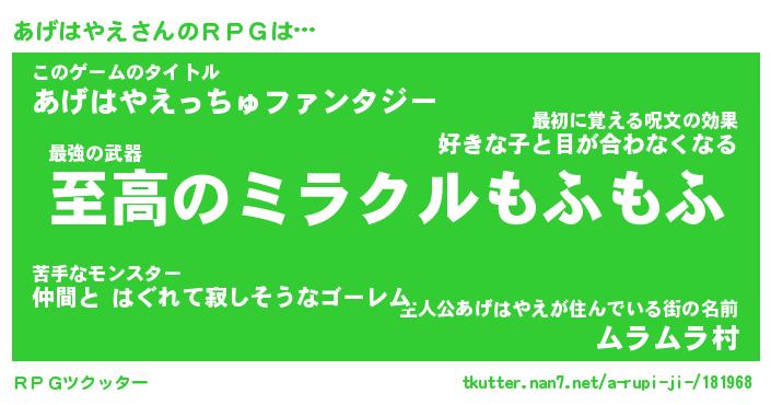 | ヒーロー風カッコイイあだ名 | 『スーパーアゲハヤエ』『幻影騎士アゲ』 |