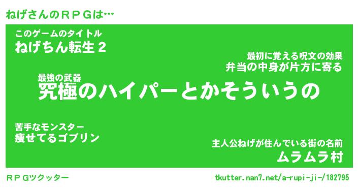 | 男性向けラノベタイトル風あだ名 | 『ねげの憂鬱』 |