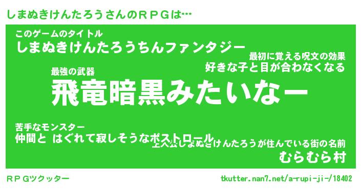 | 男性向けラノベタイトル風あだ名 | 『シマヌキケンタロウアートオンライン』 |