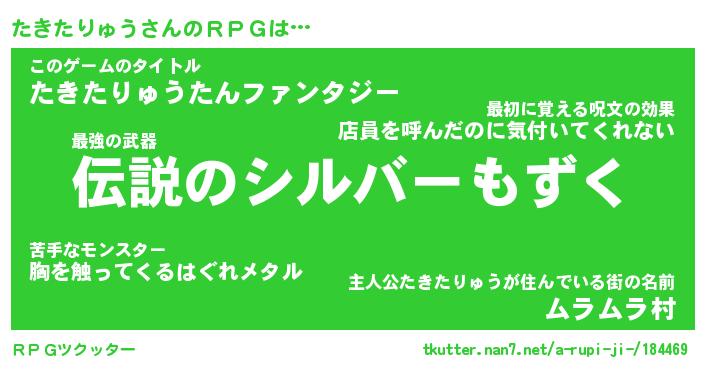 | 男性向けラノベタイトル風あだ名 | 『たきたりゅうの憂鬱』 |