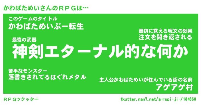 | 男性向けラノベタイトル風あだ名 | 『かわばためいの憂鬱』 |