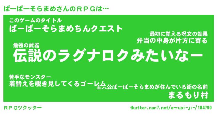 | 男性向けラノベタイトル風あだ名 | 『ばーばーそらまめの憂鬱』 |