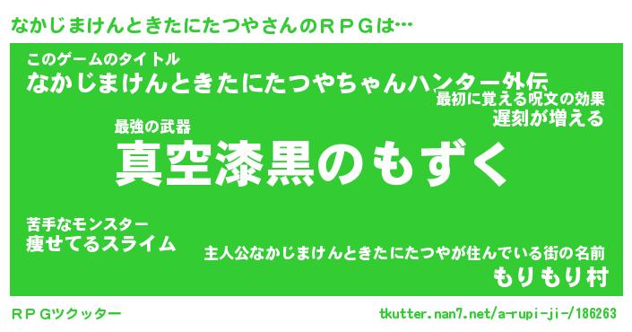 | 男性向けラノベタイトル風あだ名 | 『ナカジマケントキタニタツヤアートオンライン』 |