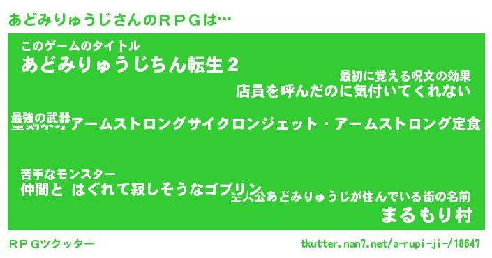 | 男性向けラノベタイトル風あだ名 | 『あどみりゅうじの憂鬱』 |