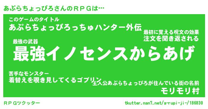 | 男性向けラノベタイトル風あだ名 | 『アプラチョッピロアートオンライン』 |
