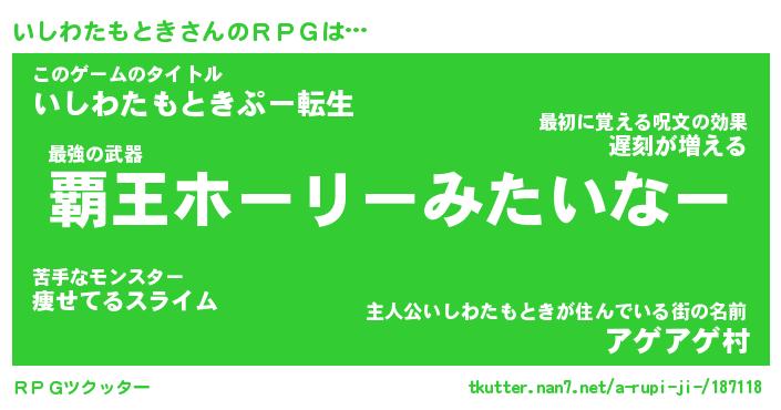 | 男性向けラノベタイトル風あだ名 | 『イシワタモトキアートオンライン』 |