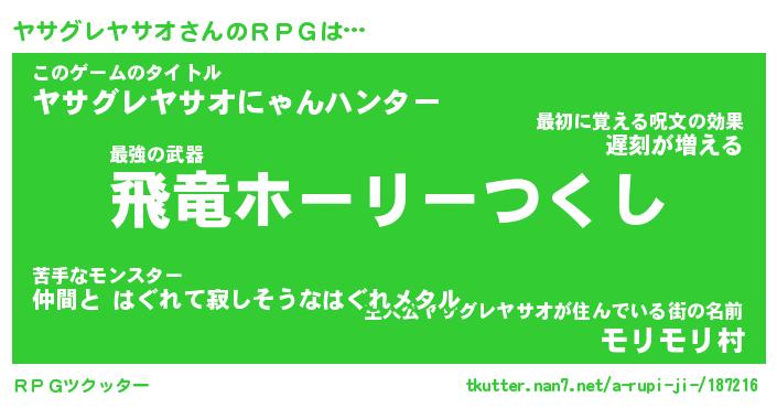 | 男性向けラノベタイトル風あだ名 | 『ヤサグレヤサオアートオンライン』 |
