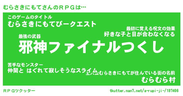 | 男性向けラノベタイトル風あだ名 | 『ムラサキニモテアートオンライン』 |