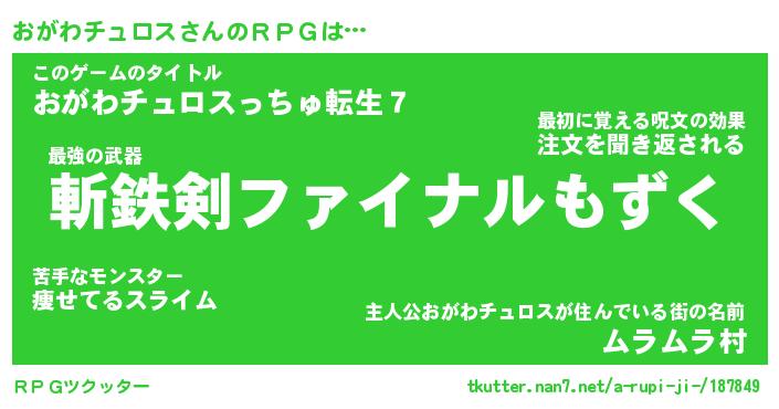 | 男性向けラノベタイトル風あだ名 | 『おがわチュロスの憂鬱』 |