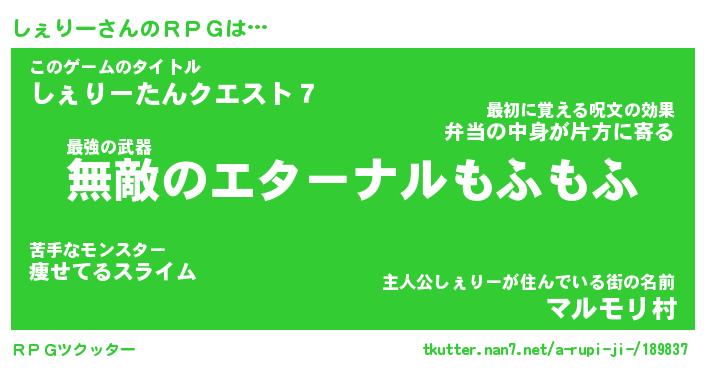 | 伝説のあだ名 | 『封印されし傭兵しぇりー』 |