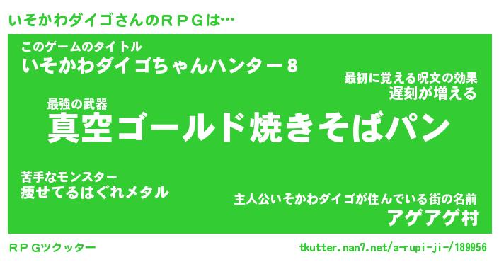 | 男性向けラノベタイトル風あだ名 | 『イソカワダイゴアートオンライン』 |
