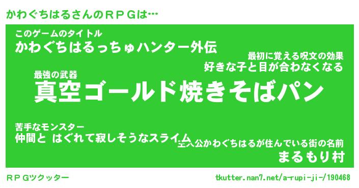 | 男性向けラノベタイトル風あだ名 | 『カワグチハルアートオンライン』 |