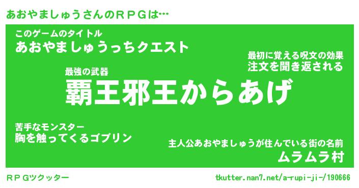 | 男性向けラノベタイトル風あだ名 | 『アオヤマシュウアートオンライン』 |