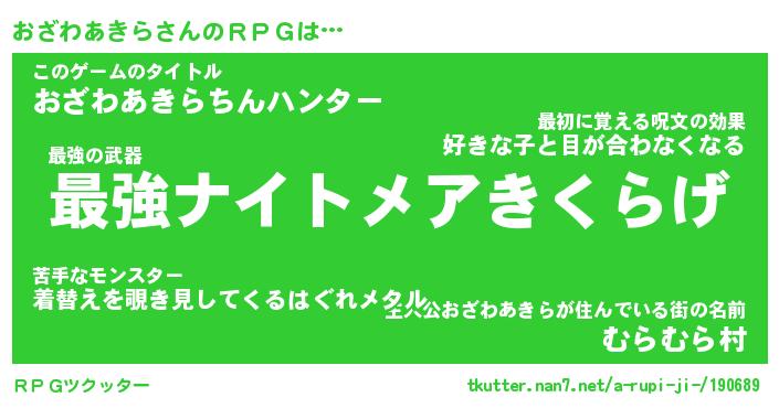 | 男性向けラノベタイトル風あだ名 | 『オザワアキラアートオンライン』 |