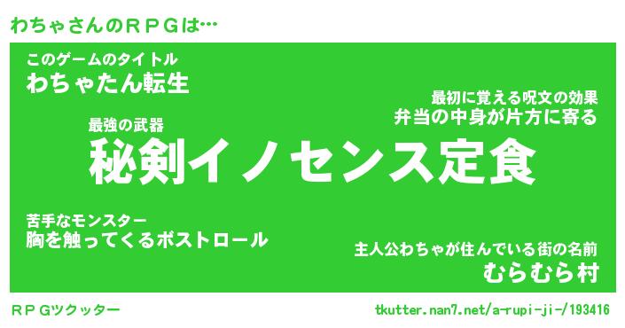 | 男性向けラノベタイトル風あだ名 | 『わちゃの憂鬱』 |