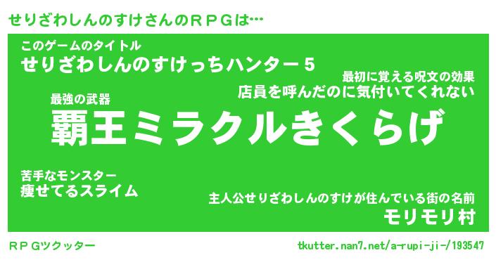 | 胡散臭い通販商品みたいなあだ名 | 『億万長者になれるブレスレット…その名も「せりざわしんのすけ」』 |