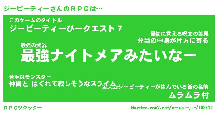 | 女子向けラノベタイトル風あだ名 | 『ジーピーティー姫と円卓の騎士』 |