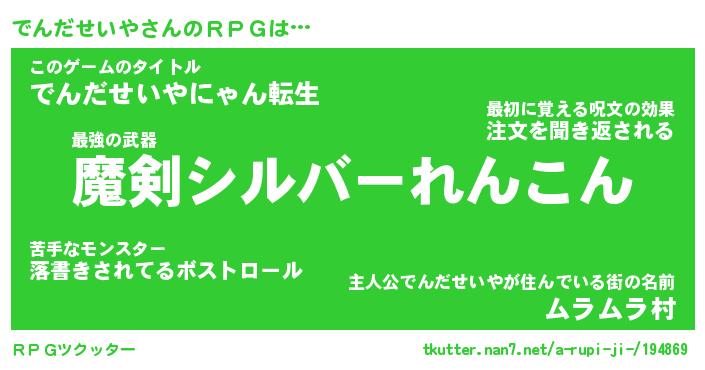 | 男性向けラノベタイトル風あだ名 | 『でんだせいやの憂鬱』 |