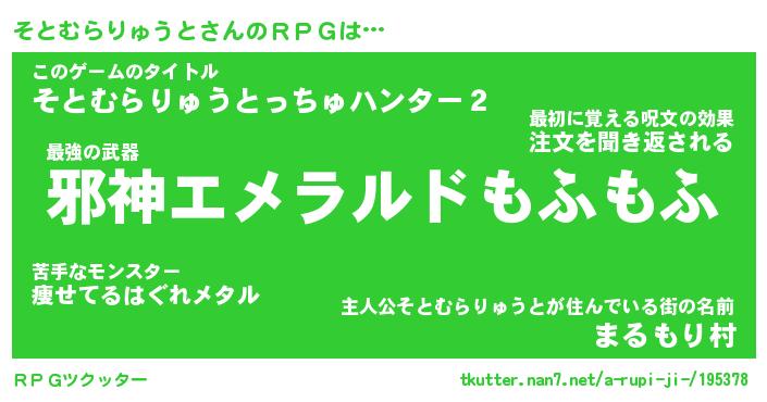 | 男性向けラノベタイトル風あだ名 | 『ソトムラリュウトアートオンライン』 |