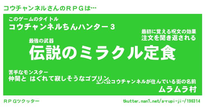 | 男性向けラノベタイトル風あだ名 | 『コウチャンネルの憂鬱』 |