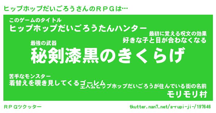| 胡散臭い通販商品みたいなあだ名 | 『必ず成功する霊験あらたかなお札…その名も「ヒップホップだいごろう」』 |