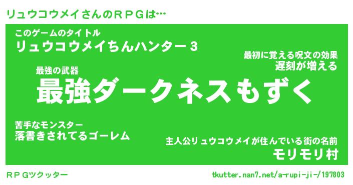 | 男性向けラノベタイトル風あだ名 | 『リュウコウメイアートオンライン』 |