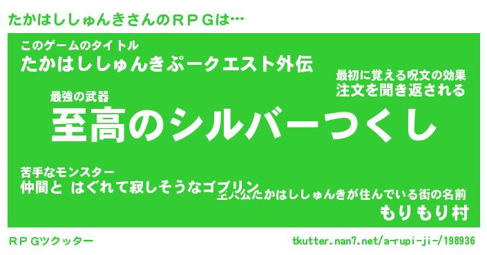 | 男性向けラノベタイトル風あだ名 | 『タカハシシュンキアートオンライン』 |