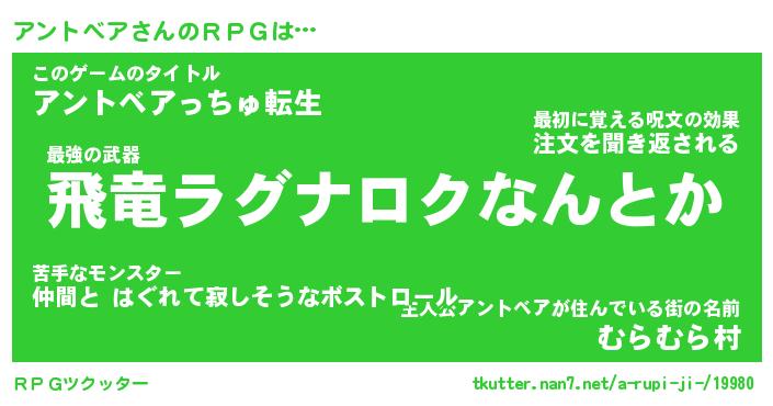 | 男性向けラノベタイトル風あだ名 | 『アントベアアートオンライン』 |