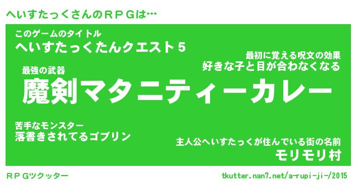 | 男性向けラノベタイトル風あだ名 | 『へいすたっくの憂鬱』 |