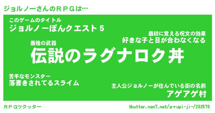 | 女子向けラノベタイトル風あだ名 | 『ジョルノー姫と円卓の騎士』 |