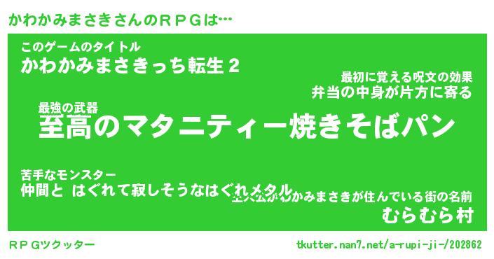 | 肩書あだ名 | 『かわかみまさき御曹司』 |