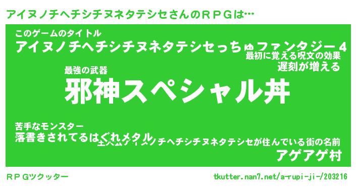 | ツイッター | アイヌノチヘチシチヌネタテシセさんのツイッターID『fukuyoka_man』 |
