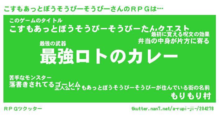 | 料理風あだ名 | 『節約★こすもあっとぼうそうぴーそうぴーと油揚げの玉子丼』 |