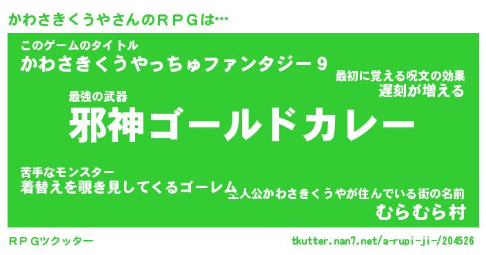 | 男性向けラノベタイトル風あだ名 | 『カワサキクウヤアートオンライン』 |