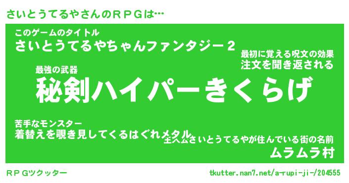 | 男性向けラノベタイトル風あだ名 | 『さいとうてるやの憂鬱』 |