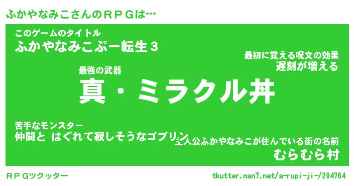 | 男性向けラノベタイトル風あだ名 | 『フカヤナミコアートオンライン』 |