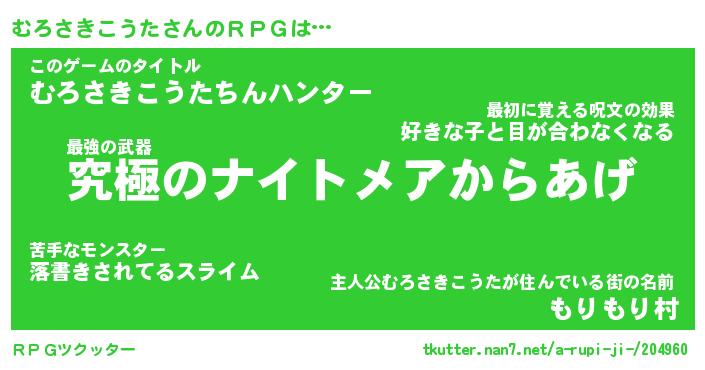 | 男性向けラノベタイトル風あだ名 | 『むろさきこうたの憂鬱』 |