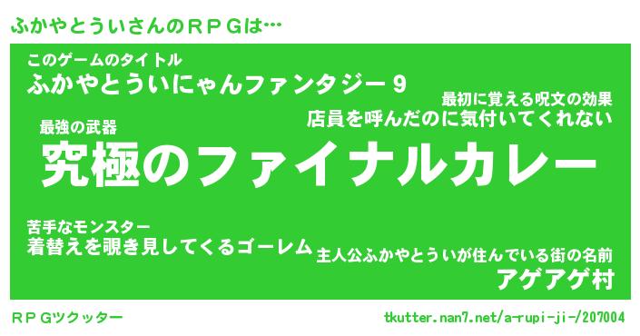 | 男性向けラノベタイトル風あだ名 | 『フカヤトウイアートオンライン』 |