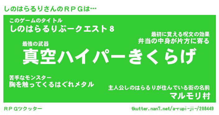 | 男性向けラノベタイトル風あだ名 | 『シノハラルリアートオンライン』 |