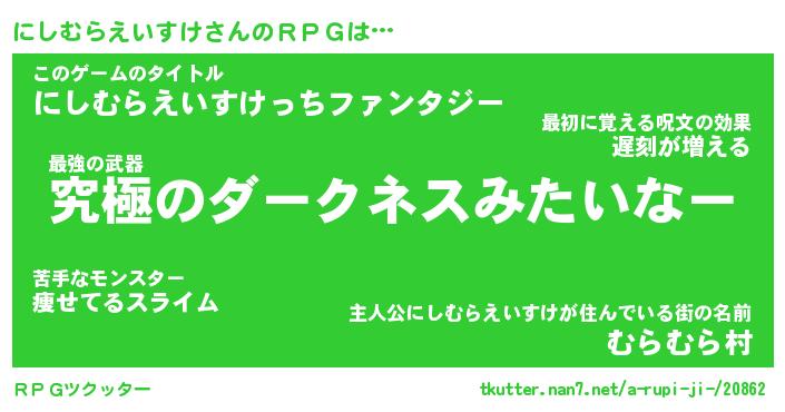 | 男性向けラノベタイトル風あだ名 | 『にしむらえいすけの憂鬱』 |
