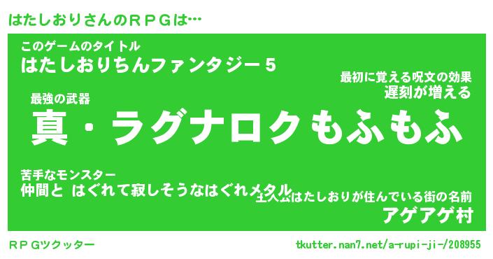 | ヒーロー風カッコイイあだ名 | 『スーパーハタシオリ』『黄金騎士ハタ』 |