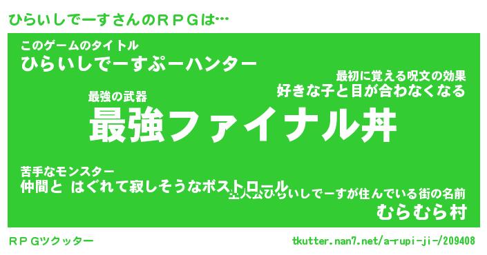 | 料理風あだ名 | 『節約★ひらいしでーすと油揚げの玉子丼』 |