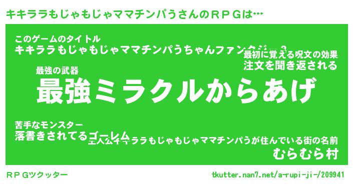 | 伝説のあだ名 | 『不死鳥の竜騎士キキララもじゃもじゃママチンパう』 |