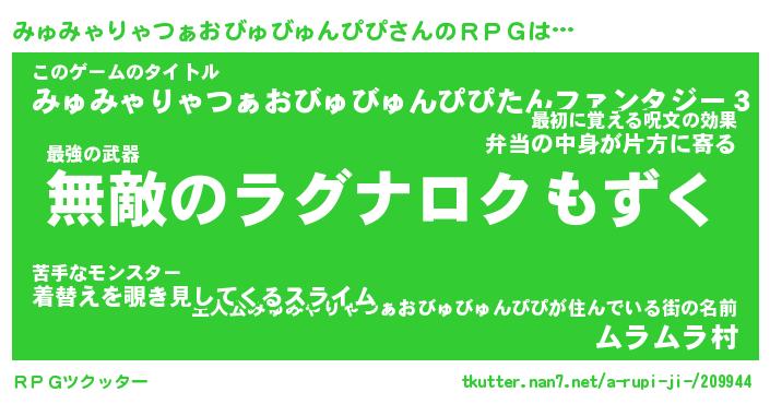 | 料理風あだ名 | 『節約★みゅみゃりゃつぁおびゅびゅんぴぴと油揚げの玉子丼』 |