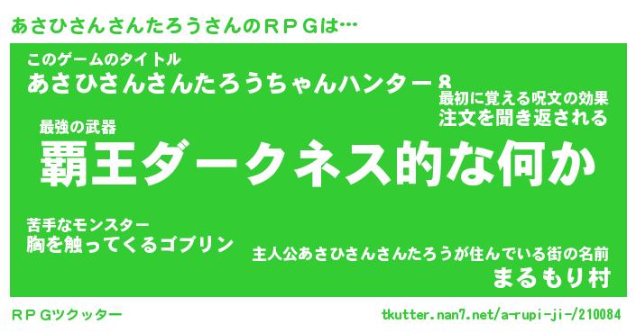 | 男性向けラノベタイトル風あだ名 | 『アサヒサンサンタロウアートオンライン』 |