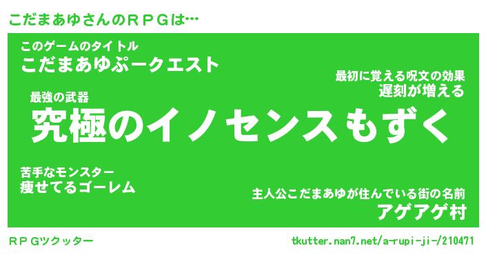 | 男性向けラノベタイトル風あだ名 | 『コダマアユアートオンライン』 |